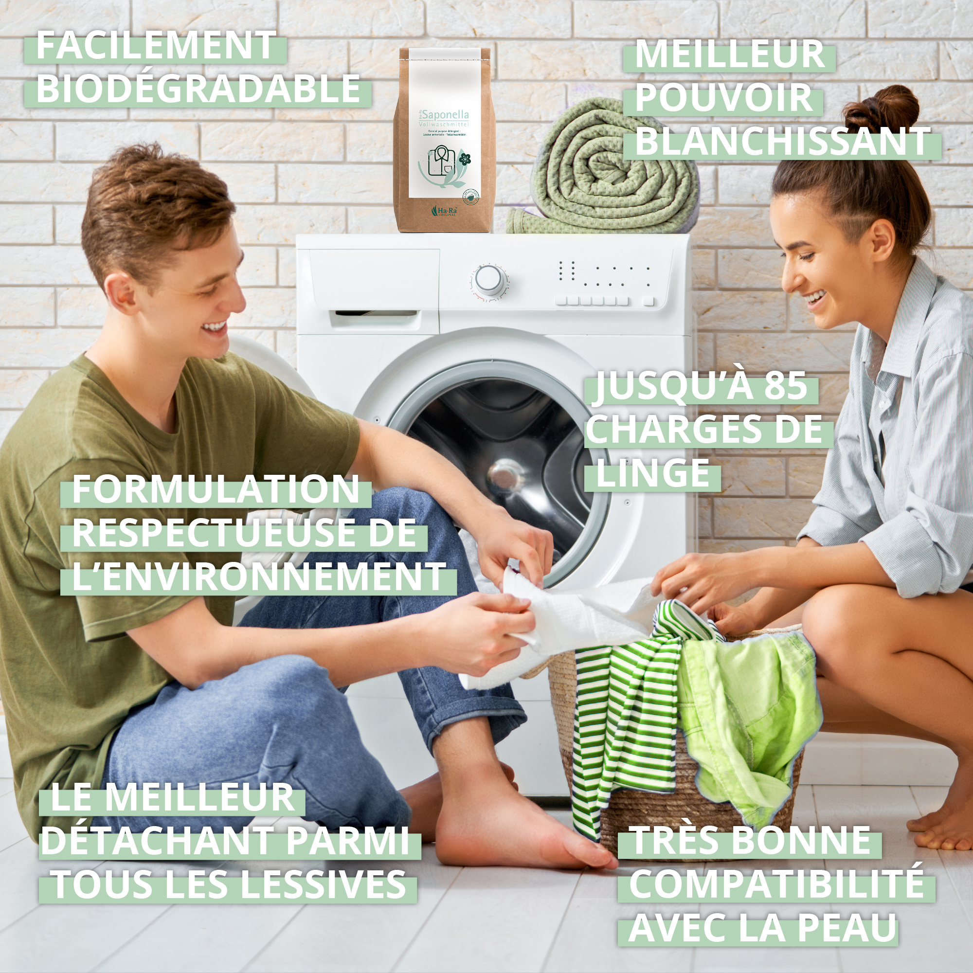 Pour le nettoyage de linge blanc en machine. Ajustée à l’idéal pour le nettoyage des fibres Ha-Ra. Ne convient pas à la laine et à la soie. CONSEIL : pour le linge de couleur, nous recommandons la lessive linge délicat Saponella de Ha-Ra.